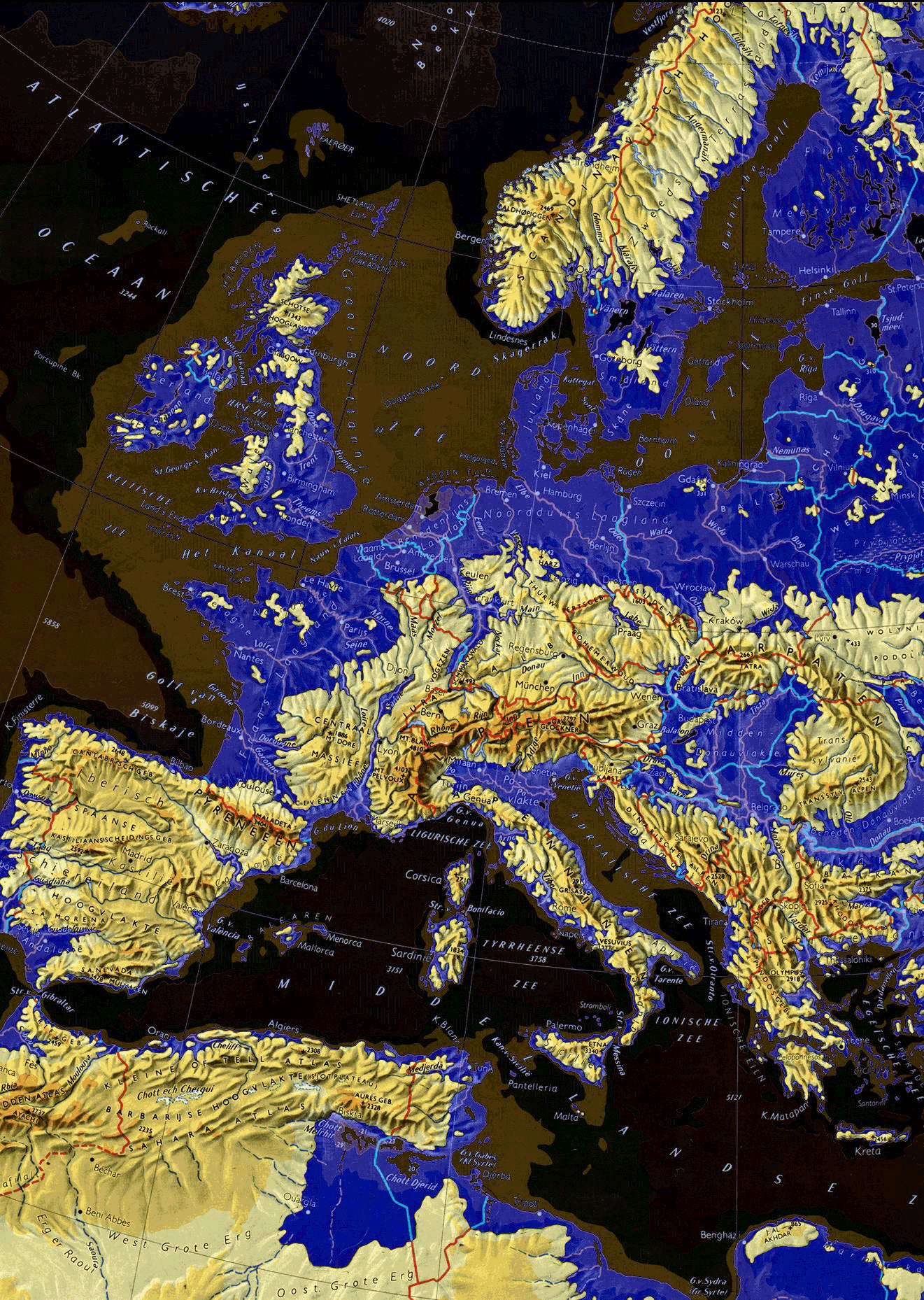 Gebiete unter 200 Meter sind blau gefärbt. 200 Meter ist etwas höher als die sichere Höhe während des bei Troubled Times erwähnten Polsprungs. Die Karte zeigt keine Überflutungsgebiete, welche den Strömen aufwärts folgen und sich nach allen Seiten ausbreiten.