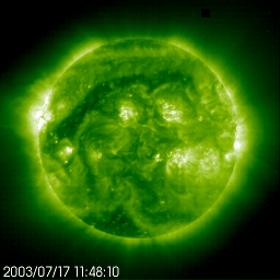 - I was just browsing through yesterday's EIT195 data, and I spotted a definite weirdness. Here are the EIT195 images from July 17 at 11:48:10 and 13:13:44 - the one is an exact 180 degree rotation of the other! I checked this in PhotoShop - they are an exact match. What's up with that?